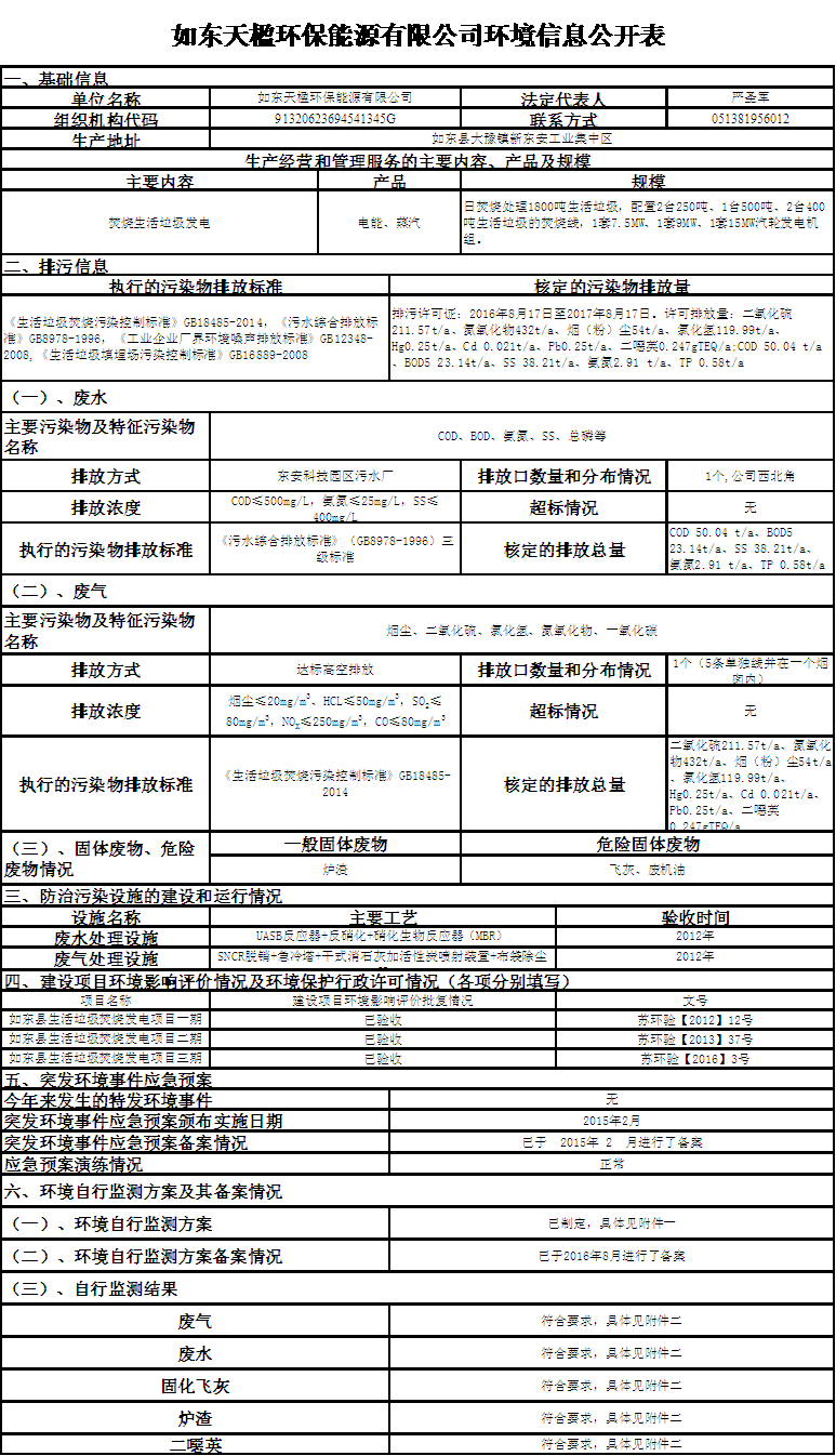 2016年上半年如東天楹環保能源有限公司環境監測數據