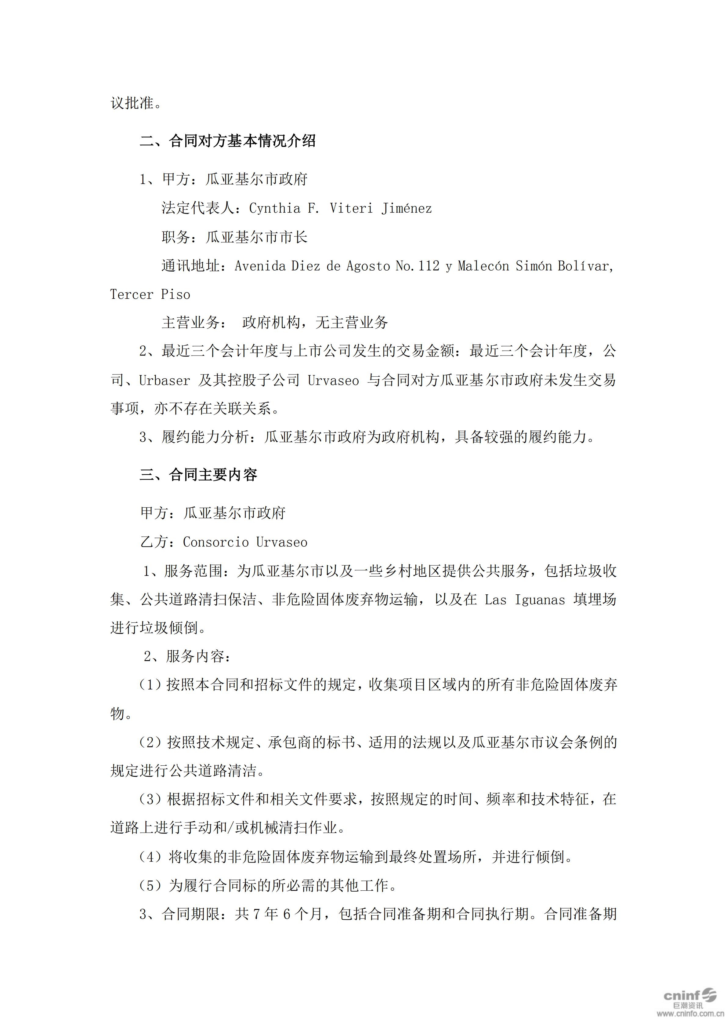 中國天楹:關于簽署瓜亞基爾市垃圾收集與道路清掃項目合同的公告