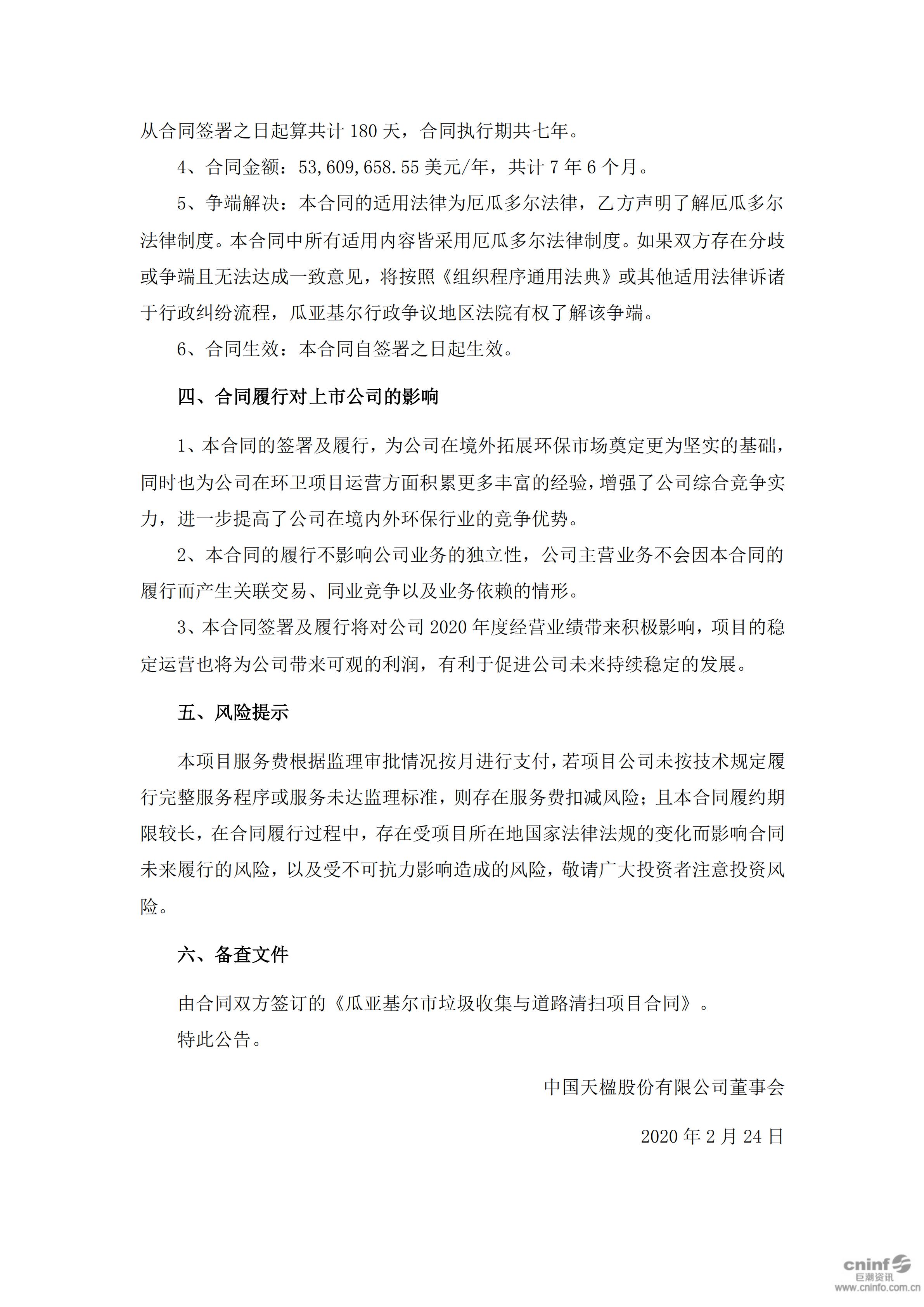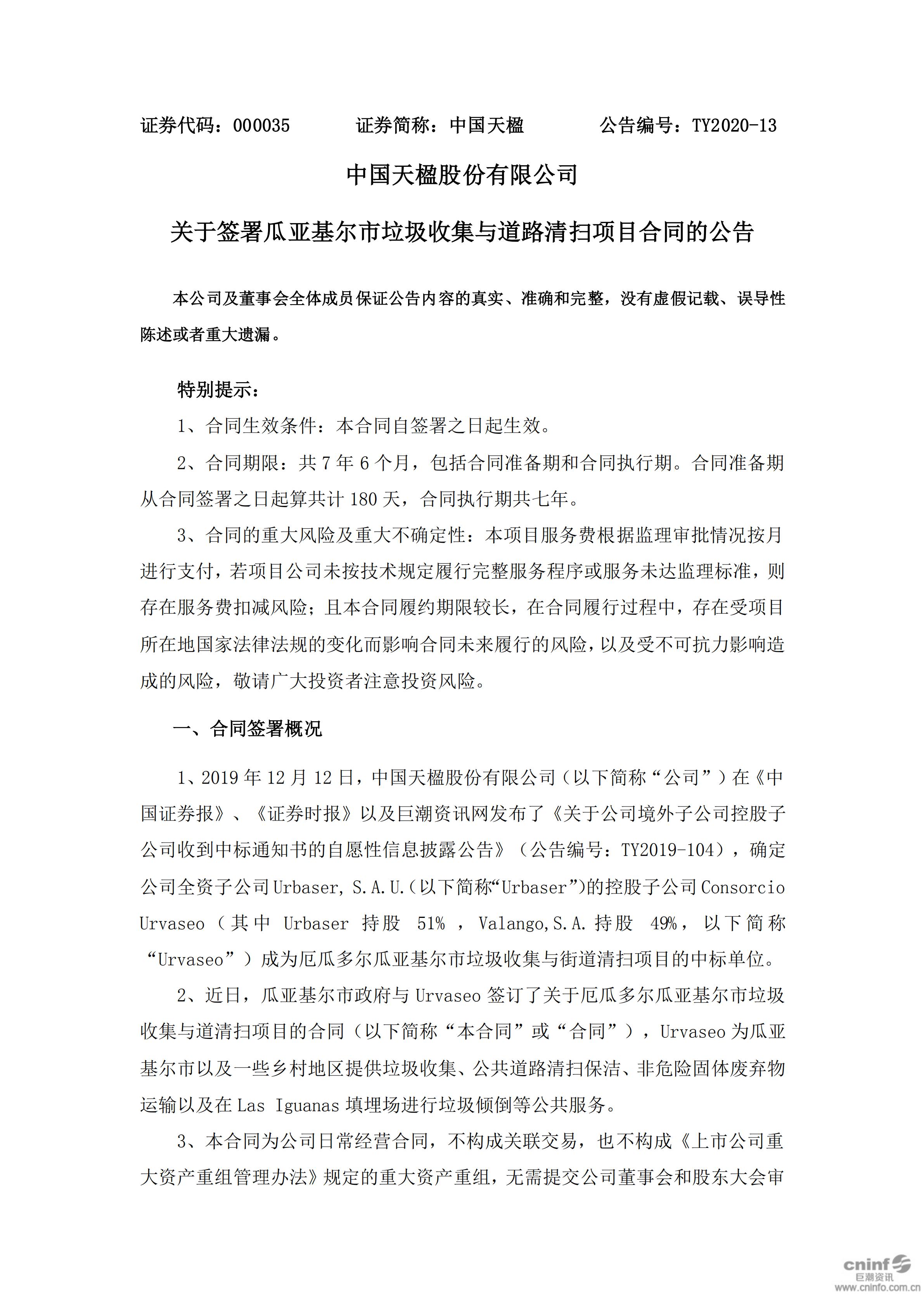 中國天楹股份有限公司關于簽署瓜亞基爾市垃圾收集與道路清掃項目合同的公告